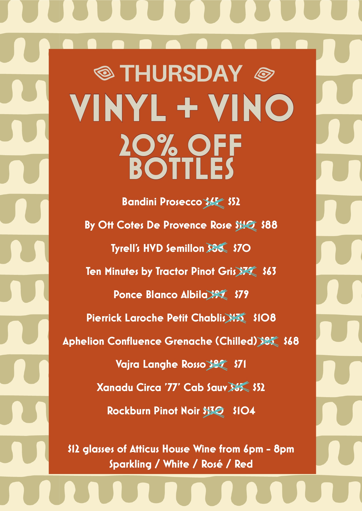Vinyl + Vino Every Thursday 20% off select wine bottles Vinyl DJ from 6pm – 8pm $12 glasses of Atticus house wine from 6pm – 8pm BOOK NOW